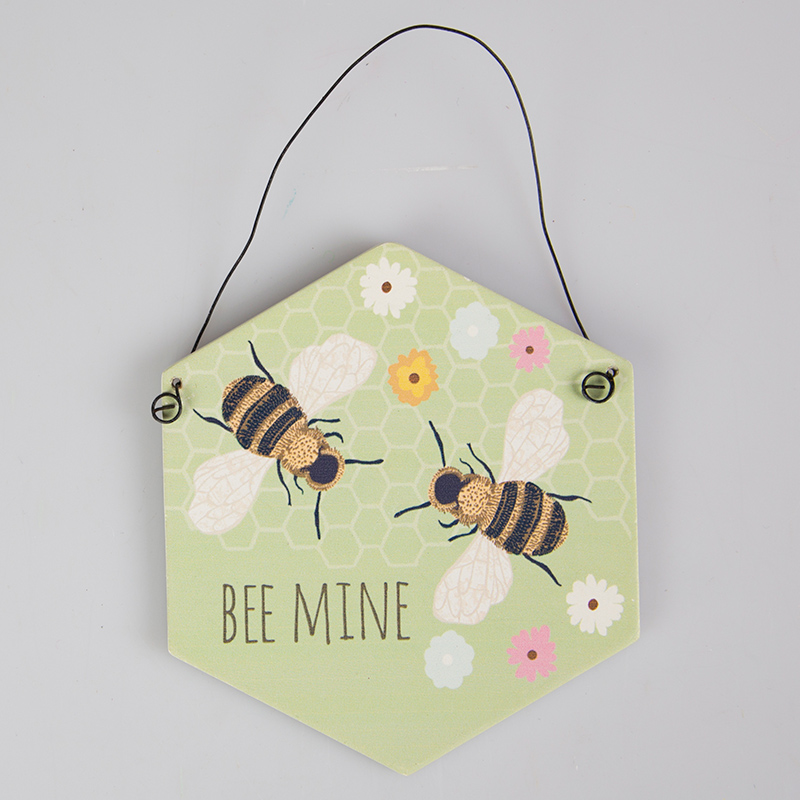 Part of our our cute Bee collection is the super range of hanging plaques.This hexagon shaped one shows two of our hand drawn bees, a few pretty flowers and the words 'Bee Mine' on a green honeycomb effect background. What an adorable little gift!